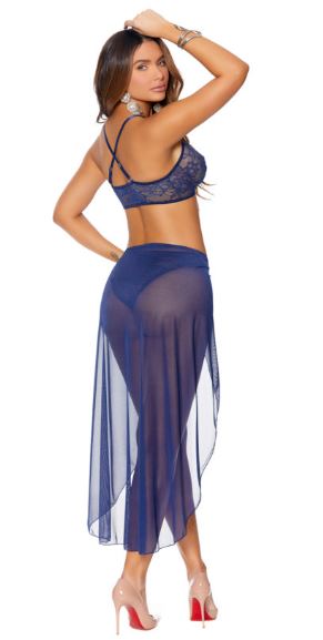 Lace bralette with criss cross front detail, adjustable straps and criss cross back. Matching lace panty with ruched back. Mesh flyaway skirt with faux tie side bow closure.